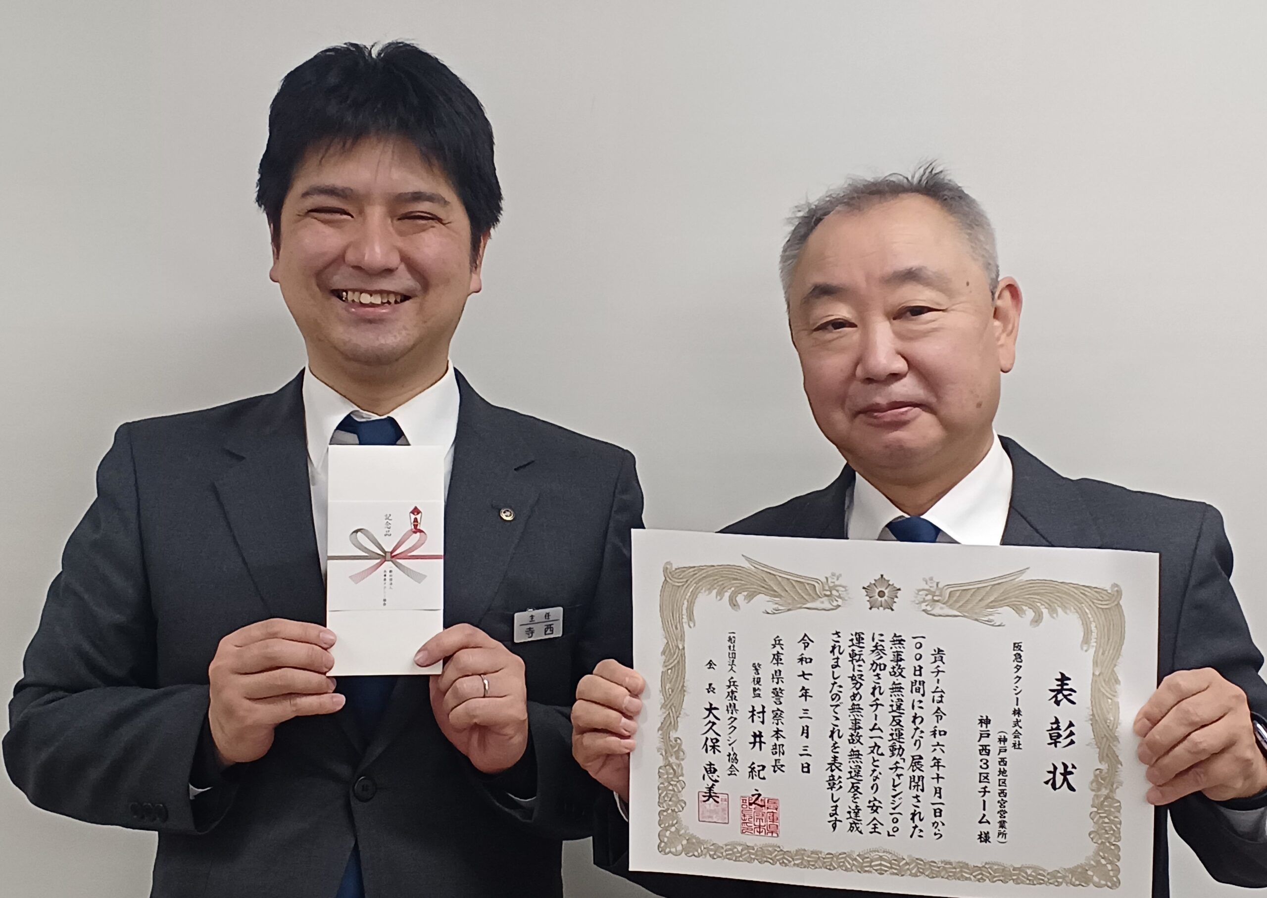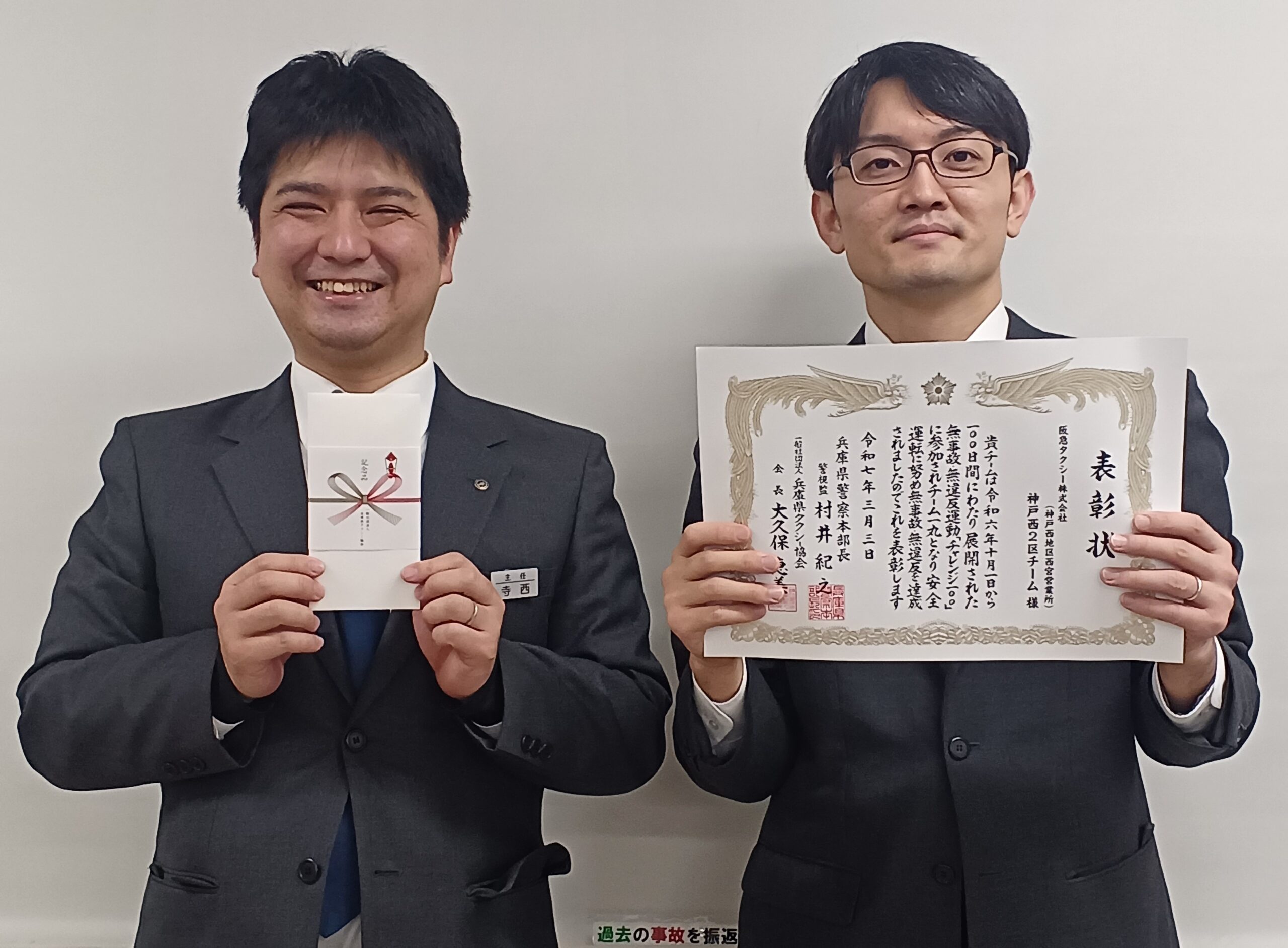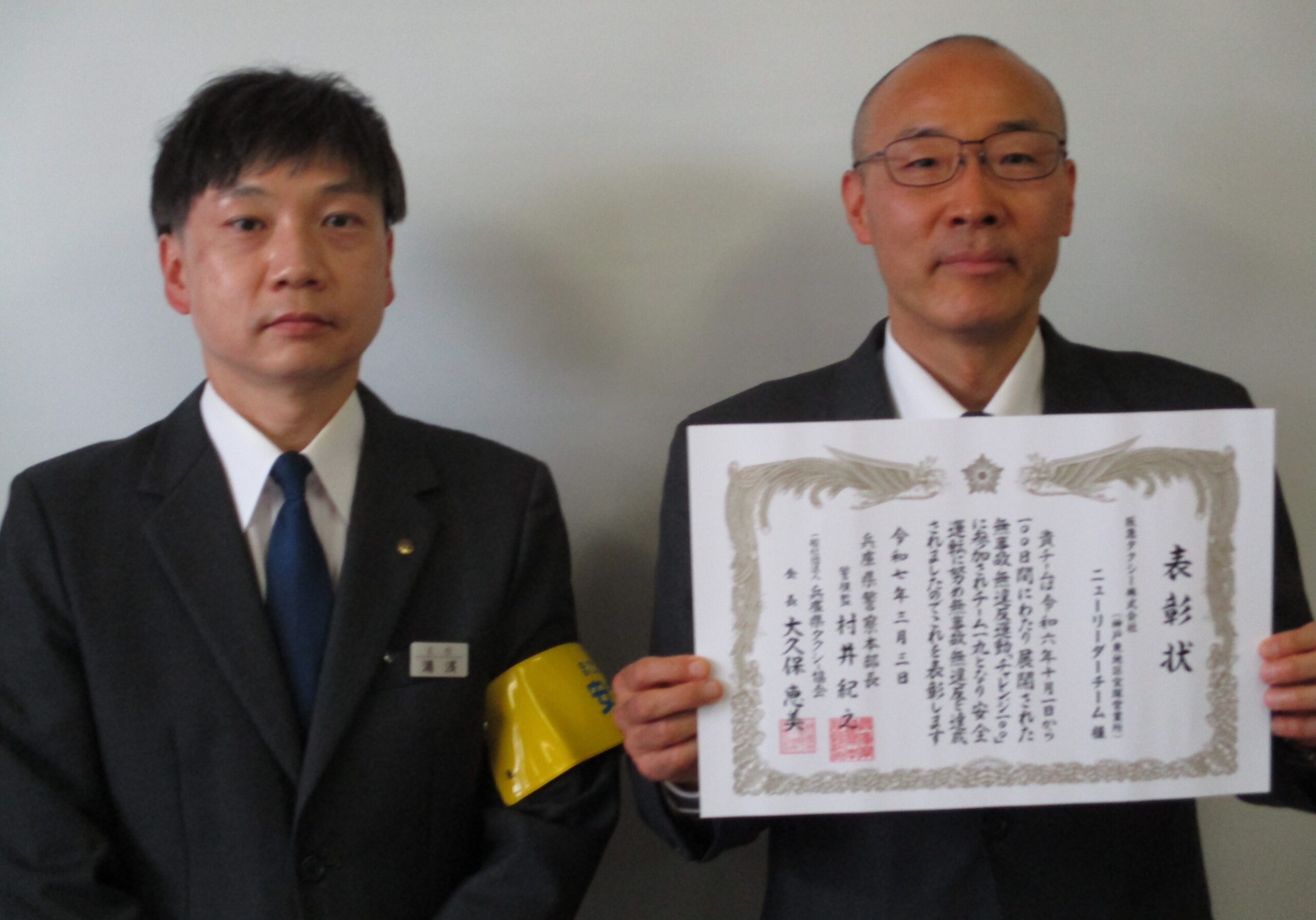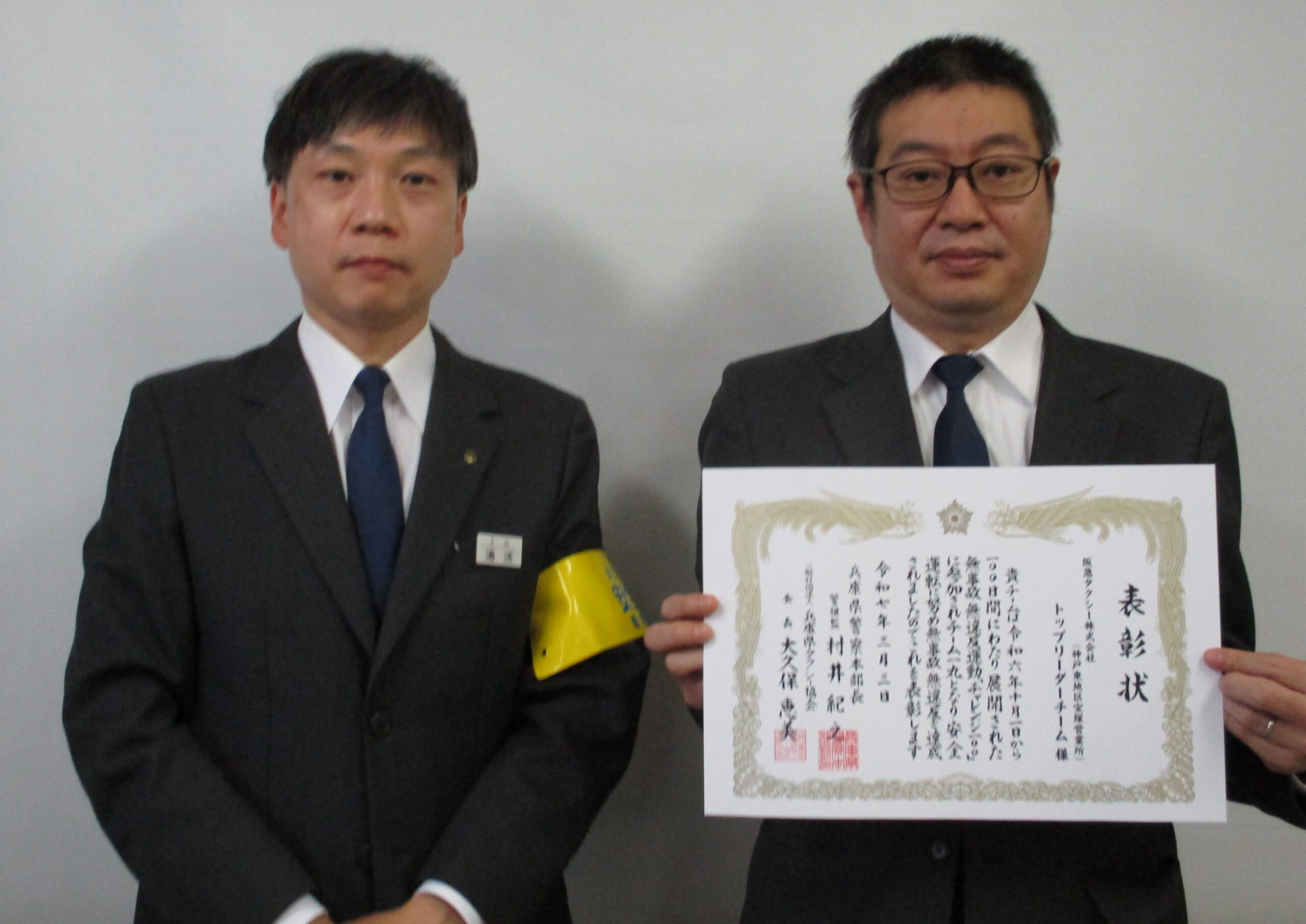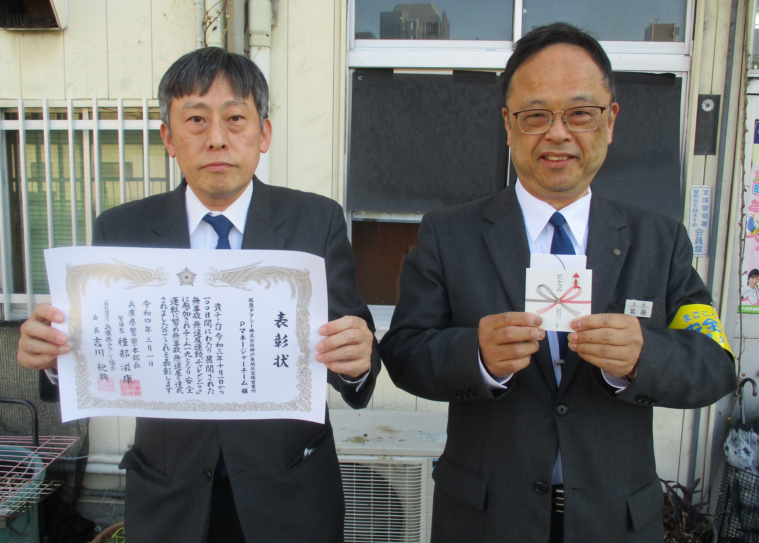 兵庫県タクシー協会では、県内事業者にて参加チーム(10人で1チーム)を編成し、積極的に乗務員の皆さんの交通安全意識を高めることで交通安全活動の推進を図り、運動期間中、無事故・無違反を達成した事業者・チームを賞揚しております。
