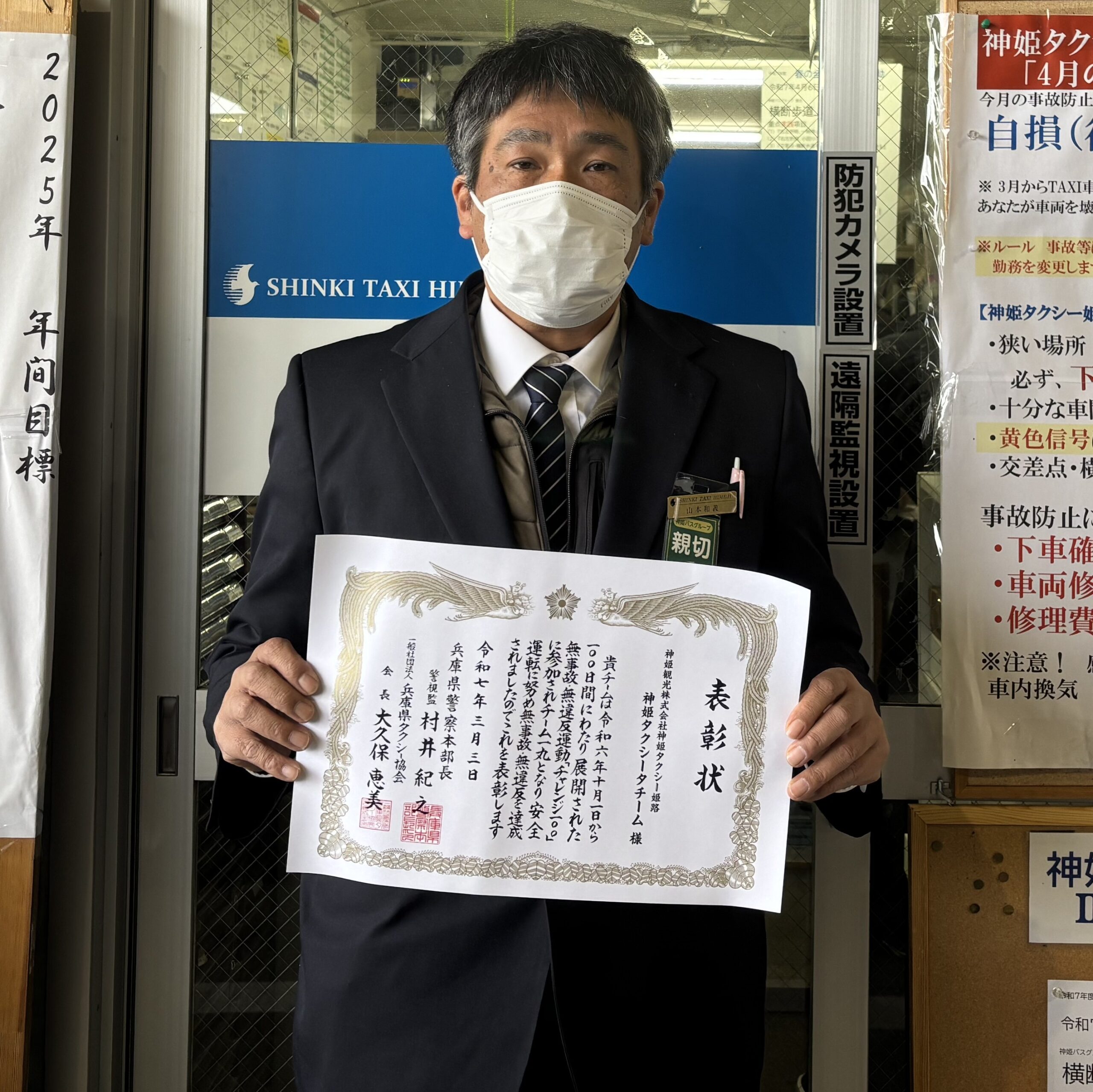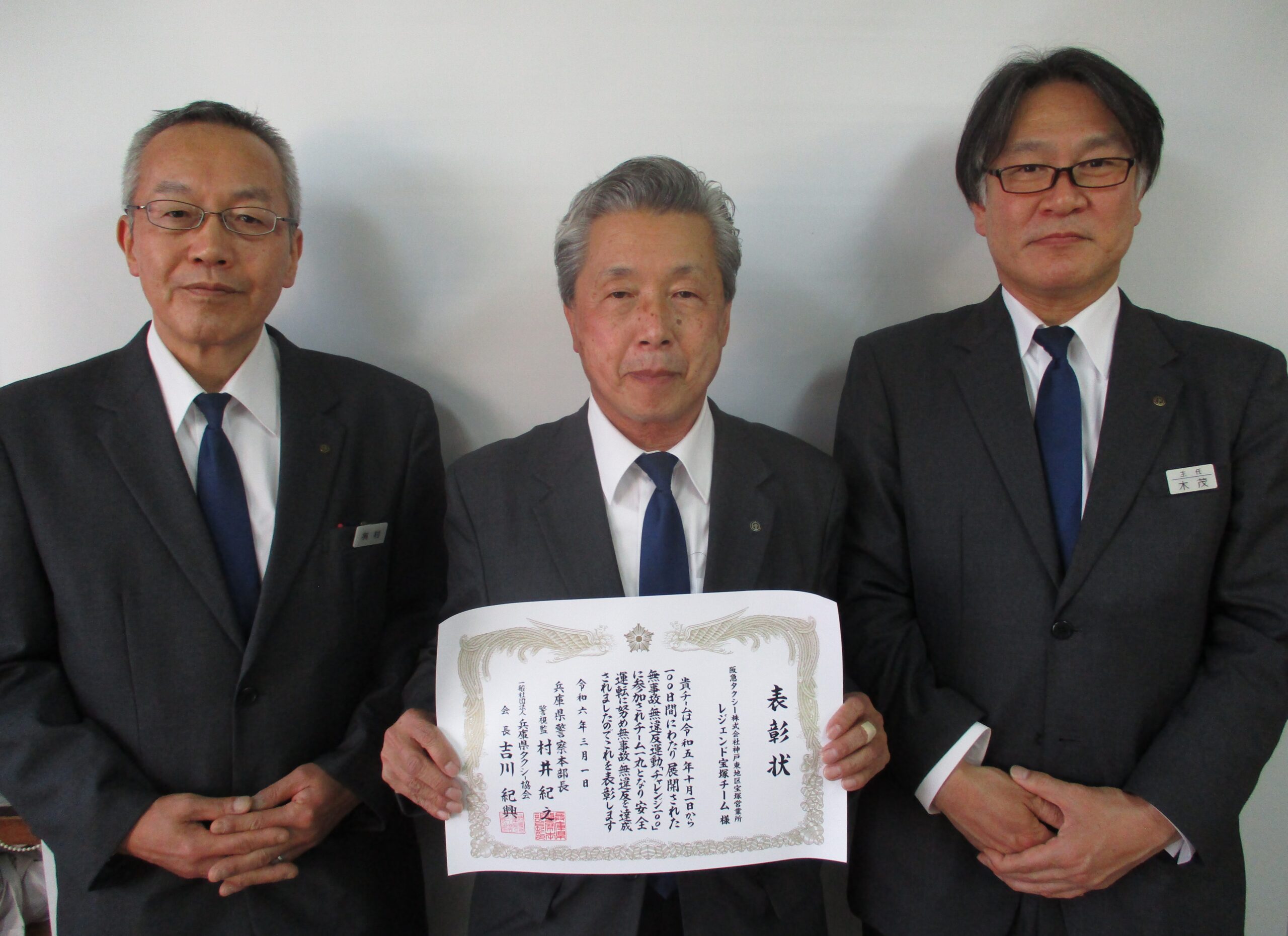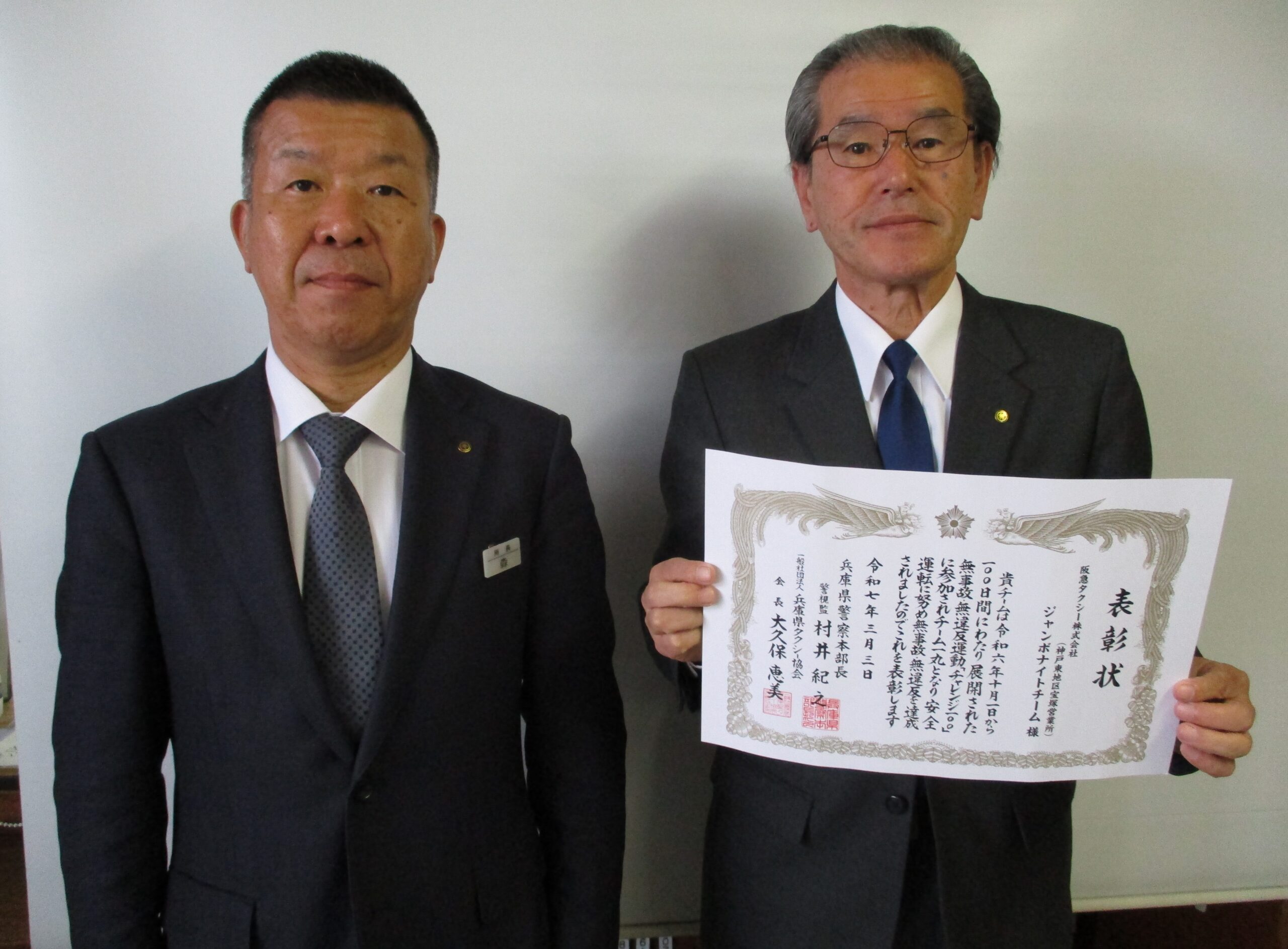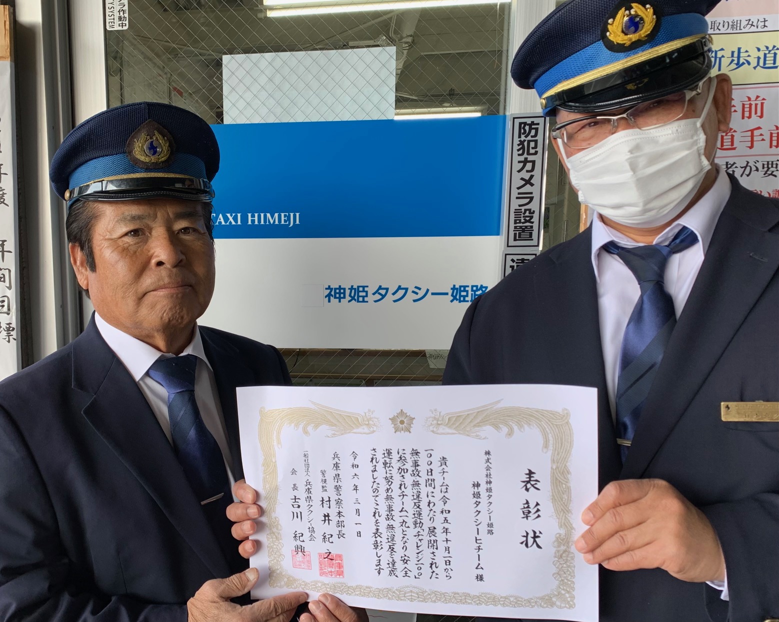 兵庫県タクシー協会では、県内事業者にて参加チーム(10人で1チーム)を編成し、積極的に乗務員の皆さんの交通安全意識を高めることで交通安全活動の推進を図り、運動期間中、無事故・無違反を達成した事業者・チームを賞揚しております。